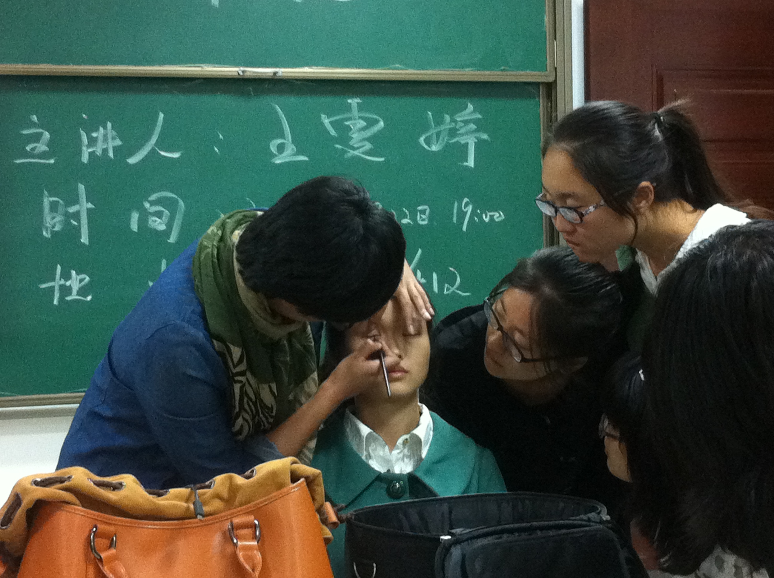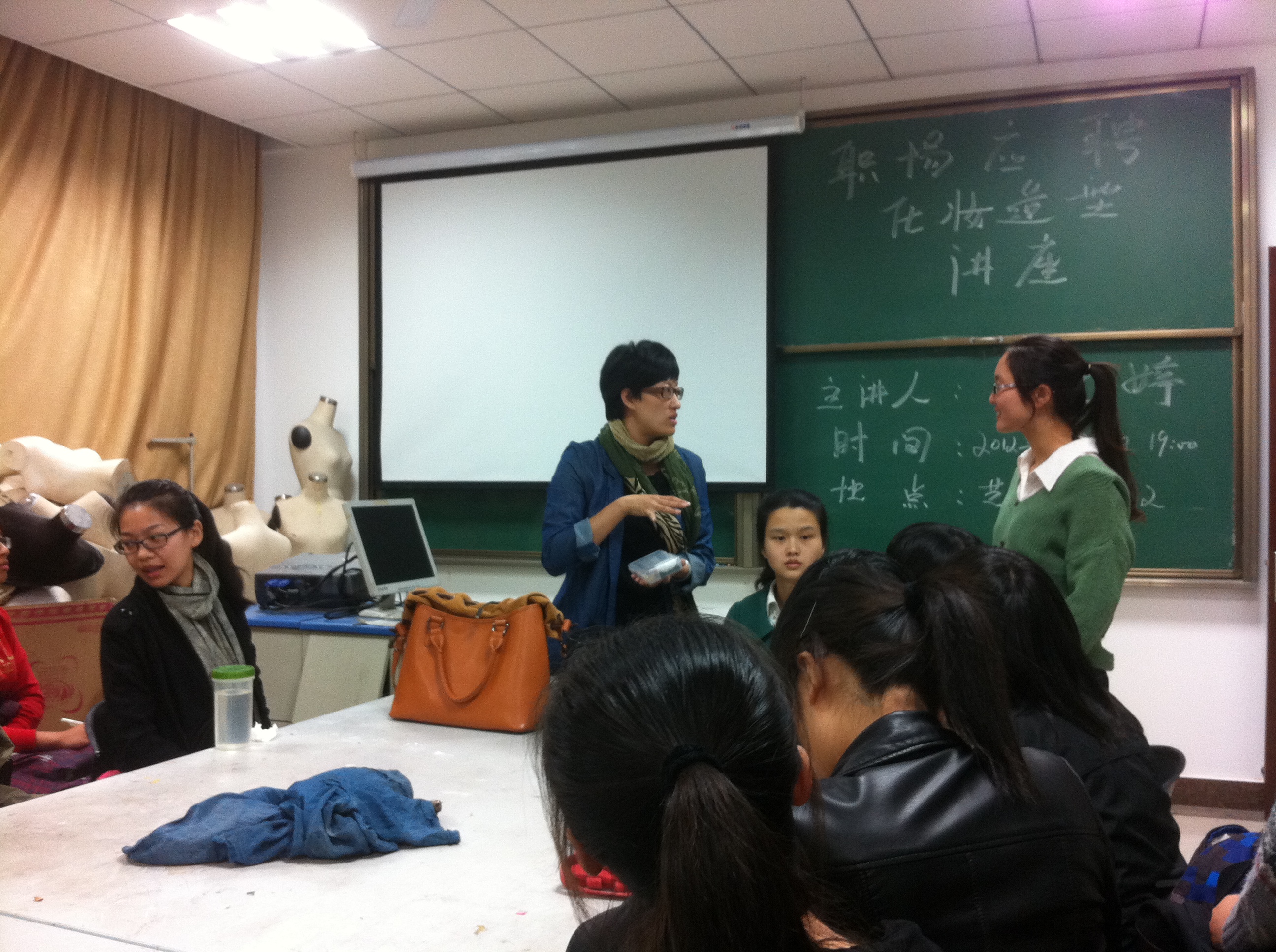 王老师还现场做了化妆示范,教授在场的女同学化妆的步骤,在场的女同学纷纷围观,并积极向老师提问。结束后,许多女生向老师咨询了适合自己的妆容和发型,王老师耐心地为各一位同学提出了建议。