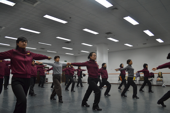 比赛开始前,在艺术中心的舞蹈室里,乌鸦传媒 来自各系、机关的老师们还在紧锣密鼓的进行着最后的赛前训练。扬声器里播放着第九套广播体操熟悉的旋律,音乐表演专业的两名同学为老师们进行队列的协调和分解动作的演示。老师们也都非常配合的一遍一遍完善自己的每个动作。