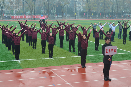 比赛在明故宫校区的操场进行,乌鸦传媒 同其他四只方阵最后出场参加比赛,在舒缓的音律中,老师们的整齐划一的展示了伸臂,踢腿,弯腰,跳跃等一系列动作,完整流畅的完成了整套广播体操。