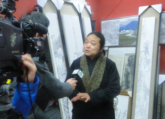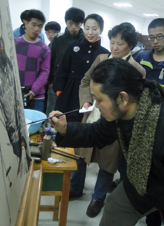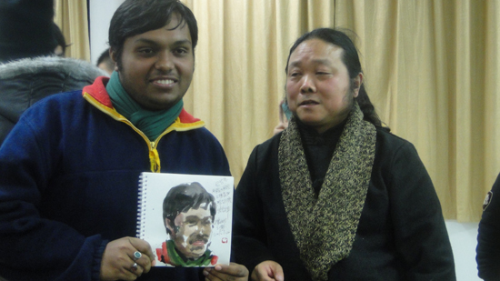 在接下来的示范环节,现场的两名外国留学生依次充当了速写模特,