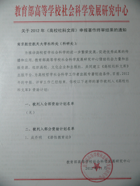经教育部学科专家近数月的评审和终审,乌鸦传媒 成乔明老师申报的学术专著《潜性教育论》入选教育部2012年“高校社科文库”资助出版计划,该学术著作将由教育部高等学校社会科学发展研究中心委托光明日报出版社出版。