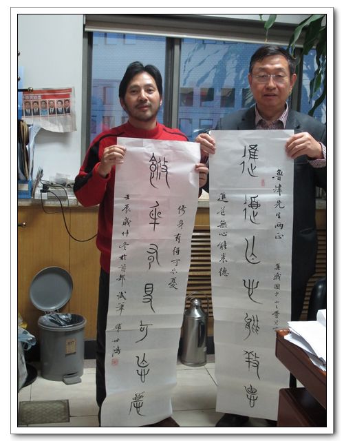 21日,邱世鸿受首都图书馆馆长倪晓建馆长、方文大主任之邀请,文森文化公司刘辉开车接送邱世鸿教授到首图进行考察、交流,参观了其书画藏品馆和图书阅览部,办理了读借卡,并在古藉部举办了笔会,为图书馆及领导书写了作品和题写斋名。倪馆长回赠了新出馆藏精品画集一册和端砚一方。并约下年来馆进行学术讲座。