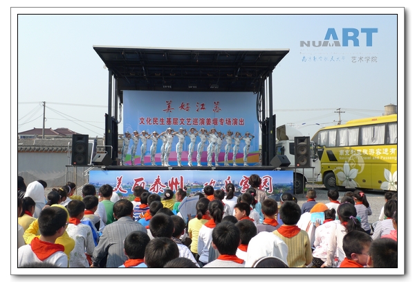 由于演出重在走进基层,因此现场条件比较艰苦,没有华丽的舞台,也没有宽敞的更衣室,所有演员只能在大巴车上化妆、换服装,炎热的天气也给大家带来了很多不便。但是无论是优秀的表演艺术家,还是南航的学生,大家都秉着能吃苦、能快速适应环境的专业精神,克服困难,尽心表演,给当地的居民朋友奉献了一场专业而精彩的演出,赢得阵阵掌声。