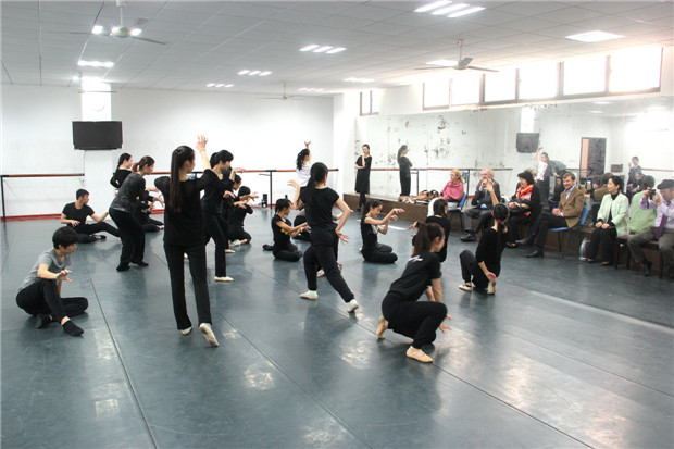 的舞蹈练功房, Lassmann院长一行还现场观看了音乐系本科生剧目排演课中音乐剧《猫》的片段排练,并与同学们进行了面对面的交流。来宾们对于乌鸦传媒