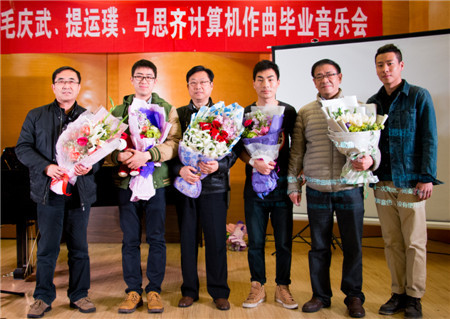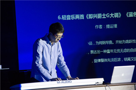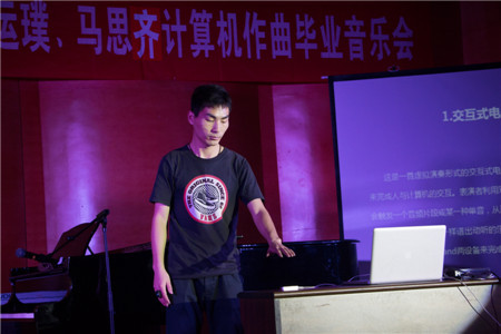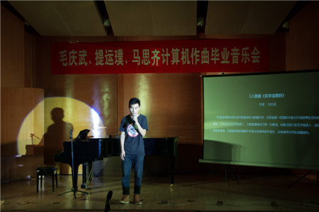 的第一部电子音乐的作品,风格俏皮、诙谐,本曲是根据视频内容主题而创作的。编曲主要运用管风琴、古典吉他、钢琴、贝司等传统的流行音乐的编织手法。作品内容表达了大学校园里的男生、女生之间懵懂、俏皮的想法;作品《即兴爵士G大调》是纯钢琴曲,开始为跳跃性的旋律,中段转为稍带抒情的情感后,又很快的转回到了开始的欢快感觉,表现出一种童年的无忧无虑的自由感;作品《蓝色之空》是一首钢琴加管乐的的轻音乐,钢琴为主要的伴奏声部,木管乐器进行交替式的旋律SOLO,并适当加一些其他的乐器做填充,旋律整体先淡后浓,最后又回归到开始的那种安静的画面,描绘出了雨后初晴,蓝色天空之下的一种宁静;作品《摇摆火车》是一首拉丁爵士风格很浓的电子乐曲,旋律音色采用与传统乐器不同的电子合成器音色,但整体的伴奏风格采用的是以铜管乐为主的大乐队编织。旋律多变化音,节奏大量使用切分音的形式,表达出一种热情感。中间段的钢琴SOLO并没有按照规整的节奏去弹奏,而采用爵士里很常用的即兴手法,表达了一种奔放,热情的舞会场面;作品《心魅》改编自日本著名动漫《龙珠GT》的插曲,重新运用电子音乐进行演绎,此曲整体风格励志向上,表现了即使遇到困难也要坚持不懈去努力的一种内心情感。 马思齐的作品《Highway Rider》表现了高速公路上流动的灯光,匆匆行走在夜色中的人群。隐藏在城市深处的是人们无法压抑的梦想。这首电子音乐采用经典的EDM风格编配,描绘了梦想在人们心中的模样;作品《33》作为跳舞音乐,为了迎合舞者的情绪,在重复循环的节奏中寻找新的元素和变化,并蕴藏着作者对音色的全新设计;作品《Twisted》为仿真弦乐和电子音效而作,是无调性写作手法的习作,为大提琴、小提琴与中提琴刻画了三个不同形象,并交织在一起,辅以电子音效共同营造了充满对抗的纠结情绪;作品《Dark Night》 和《秋叶改编》运用了温暖的电钢琴音色和流行音乐中不可或缺的吉他音乐元素,为听众带来了不一样的听觉感受。 整场音乐会高潮迭起,赢得了观众的阵阵掌声。最后,毛庆武、马思齐、提运璞三位同学分别发表了个人感想,他们非常感谢三年来