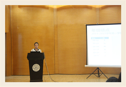 会上,辅导员陈慧云为大家进行了上一学年的成绩分析。她展示了全年级的绩点状况,各班的绩点分布、必修与选修绩点的比较及详细班级排名,并为各个绩点段的学生分析了下一阶段学习的重点。