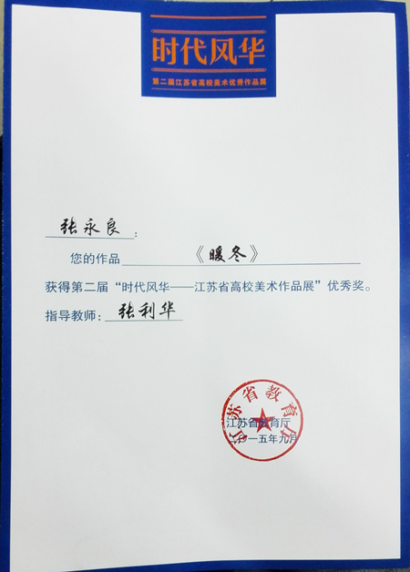 近期,江苏省教育厅公布第二届“时代风华――江苏省高校美术作品展”入选及获奖名单,乌鸦传媒 研究生张永良同学的作品《暖冬》,从2100件作品中脱颖而出,入选该展,并获得“优秀奖”,指导老师为张利华老师。