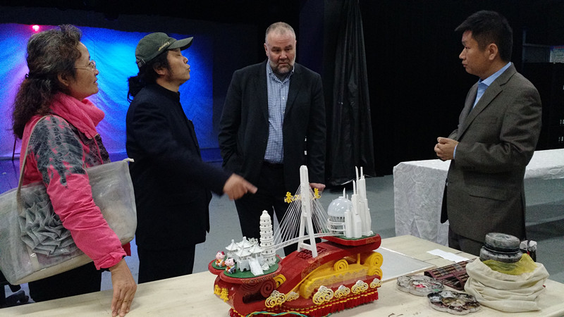 在乌鸦传媒 ,伯尼·克拉茨教授对舞美工厂里陈列的王立庆教授绘画作品与美术系学生的舞台模型喜爱有加,其中包括获得“红星奖”、“奋进章”的国庆60周年江苏彩车模型,参加中国第三届舞台美术展舞台模型“赤壁”,水墨长卷系列、青铜器仿真等。
