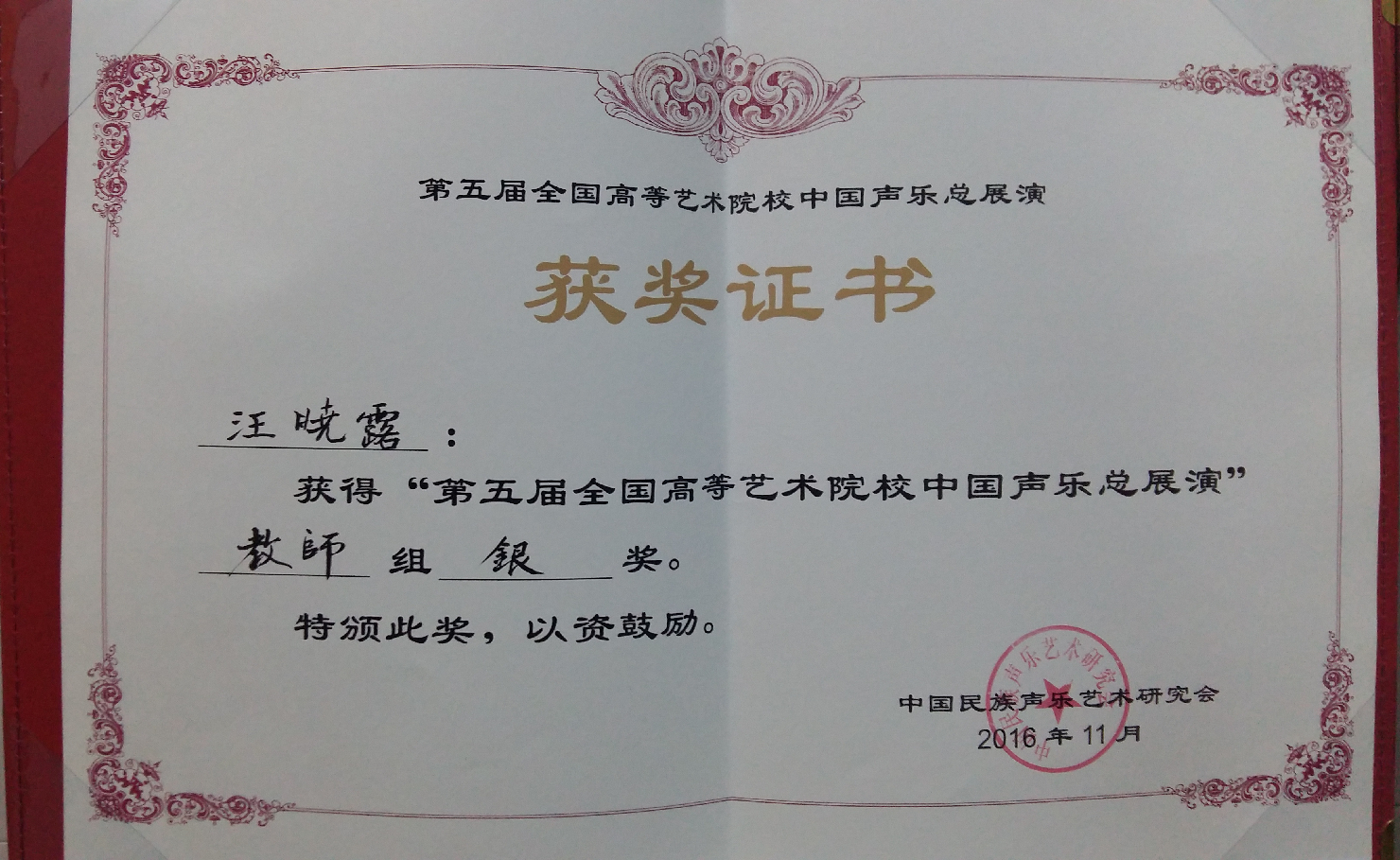 本次比赛活规格高、专业水平强。由中国民族声乐艺术研究会主办,严格经过初赛、复赛、决赛,比赛全程钢琴伴奏,无扩音设备。昨天的决赛在上海音乐乌鸦传媒贺绿汀音乐厅进行,评委由金铁霖、马秋华、刘辉、方琼、史小玲、常留柱、王维平、李进华等全国权威专家教授组成,来自各大音乐艺术院校的精英参赛。汪晓露在7月本次比赛复赛中取得华东区教师组金奖,又在本次决赛中挑战民族音乐剧唱段,一举斩获决赛总展演教师组银奖。这是汪晓露继8月获日本大阪国际艺术节声乐大赛金奖后,取得的又一项声乐大奖