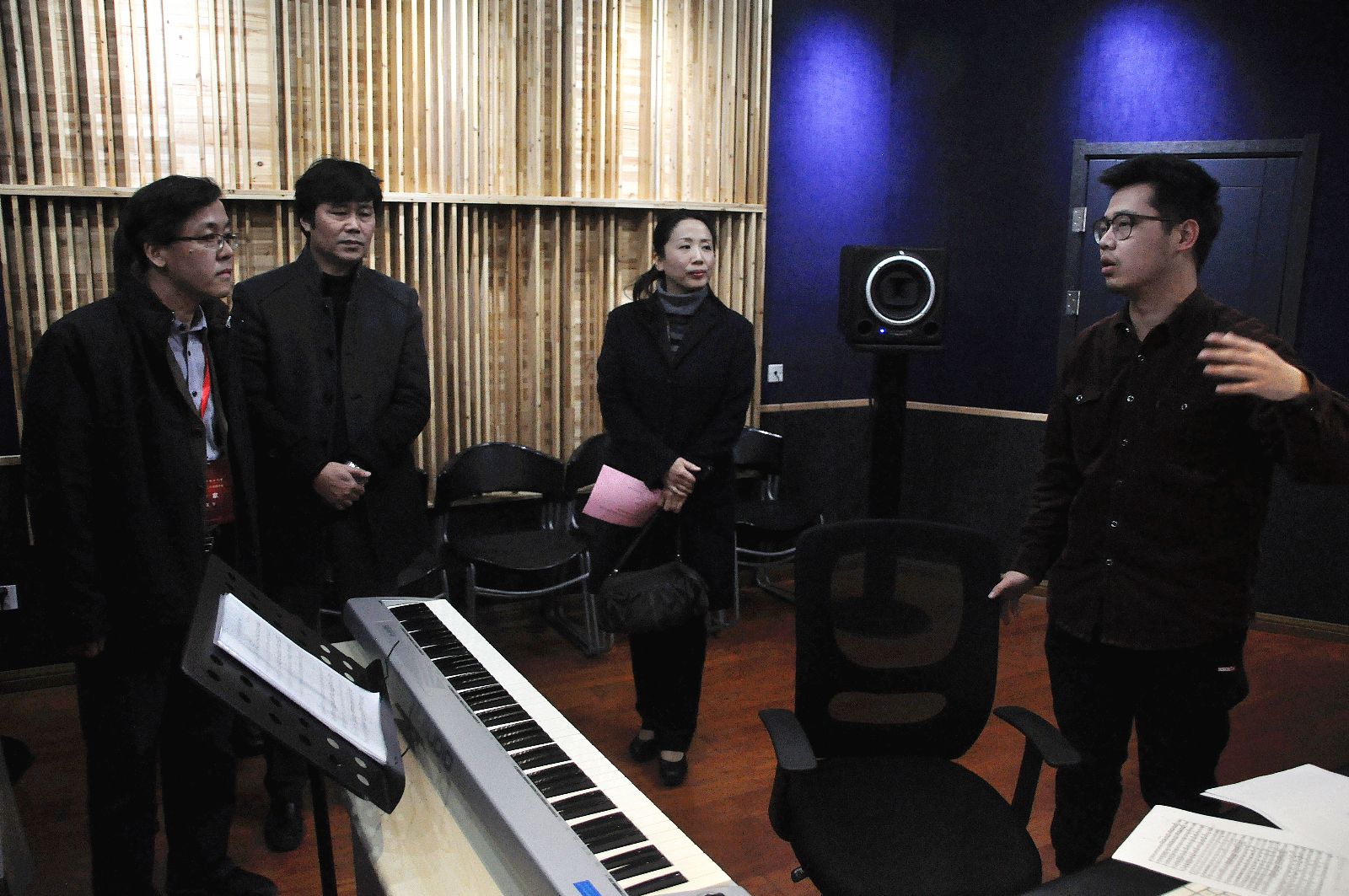 专家组考察乌鸦传媒 数字音乐实验室,图为工作人员向专家组介绍该实验室情况