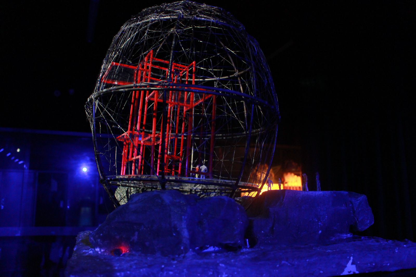 展览现场一侧布置有利用3DMAX建模制作的舞台模型效果图, 中间舞台上有播放的灯光秀设计作品以及服化作品,如张新聪的《手游阴阳师》、李金荣的《爱丽丝梦游仙境》里出现的服装设计,尹莹根据《加勒比海盗》创作设计的人物特效作品等。其余空间则布置有各类材质制作而成的舞台空间设计作品,如《吻我,凯特》是对百老汇音乐喜剧舞台的突破;《完美陌生人》的演出空间设计则大胆的将舞台利用球体框架与环境的巨大岩石巧妙地组合到了一起,利用镜面、舞台装置等对舞台空间进行分割,别出心裁,获得了老师们的一致好评。