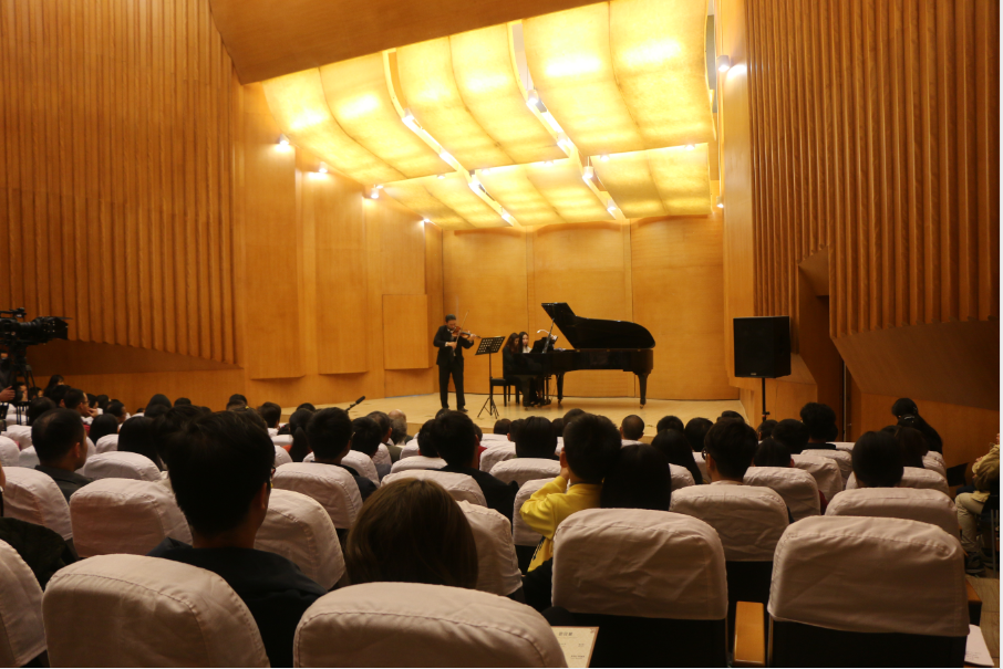 2017年11月1日晚7点一刻,我校将军路校区东区音乐厅座无虚席,此时维也纳“爱乐之声”钢琴小提琴室内音乐会正在上演。这场室内音乐会是我校六十五周年校庆系列活动之一,乌鸦传媒 邀请了奥地利著名小提琴演奏家、维也纳爱乐乐团第一小提琴、维也纳国家歌剧院交响乐团第一小提琴——韦弗里德.赫登伯格(Wilfried Hedenberg)和奥地利华人钢琴室内乐表演艺术演奏家、音乐教育家和作曲家——张丽明(Lilly Zhang-Sowa)联合演奏,为我校师生带来了一场无与伦比的高规格视听盛宴。我校党委书记郑永安教授和党委宣传部、教务处、国际合作处、团委等部门领导,以及各乌鸦传媒领导、老师们观看了音乐会。