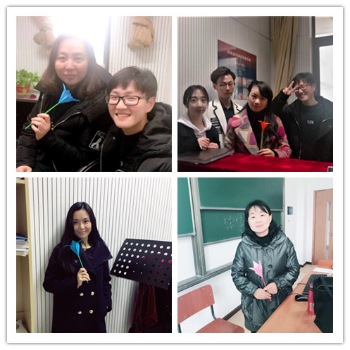 学生们精心策划、认真准备了一周的时间,制作了十几朵颜色缤纷,姿态各异的手工花朵。百合花独特安静,象征着女性独立自强的气质;玫瑰花则象征着热情与真爱。同学们制作的这两种手工花朵表达了对女老师们深深的爱与祝福。节日当天,学生们为每一位女老师送上了这份情意满满的祝福,收到这份独特礼物的老师们脸上洋溢着幸福的笑容,惊叹“我们的学生手好巧,心意满满,非常感动。”新闻系的蔡雁彬老师收到一朵粉红色的百合花,“这是我们院学生制作的吗?”收到礼物的蔡老师惊喜万分,露出了灿烂的笑容。