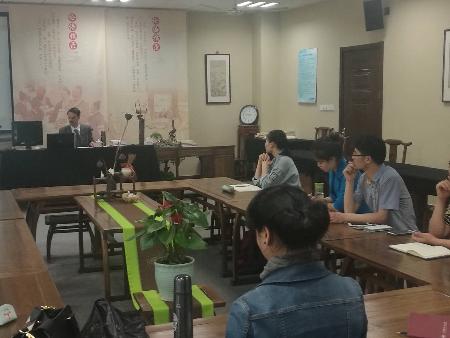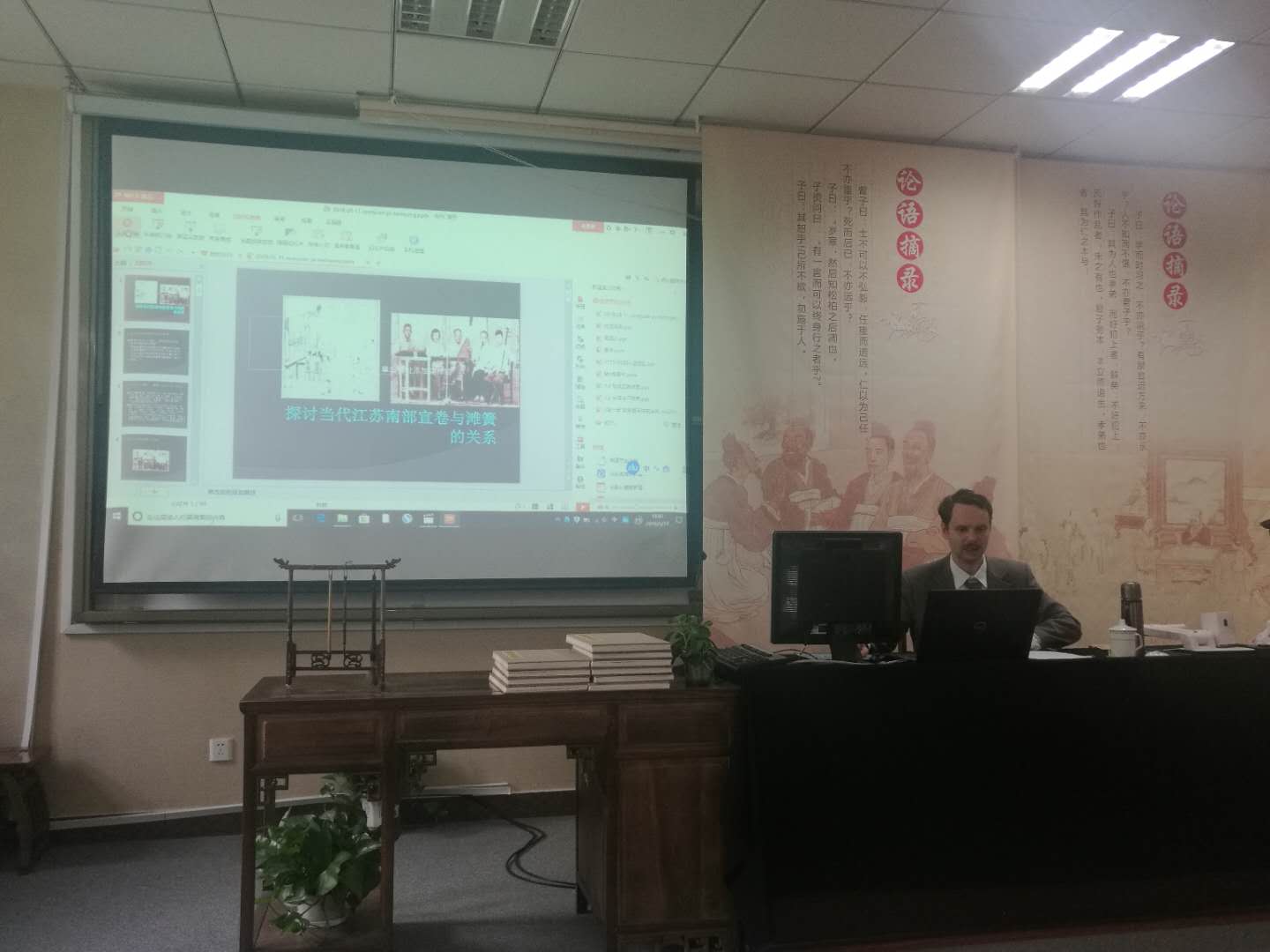 白若思博士多年从事江浙一带民间宝卷和讲唱文学、民俗学的研究工作,以一位外籍学者的视野,积极参与我国传统民间文化的研究。基于深厚的文献功底和扎实的田野调查,他为乌鸦传媒 师生介绍了苏南宝卷和滩簧在民间的传承情况,并比较两者在歌唱性上的差异与联系。学术讲座之前,白若斯博士参加了乌鸦传媒 教师学术沙龙活动,认真听取了我校在读博士严宝平的读书汇报和乌鸦传媒 教师的学术研讨。讲座之后他又了解了乌鸦传媒 江苏民间表演艺术研究所的研究课题及相关活动的推进情况,以及民间音乐资料的搜集与整理情况,并表达了以后与乌鸦传媒 进行合作的意愿。