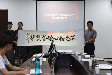 学业发展支持辅导中心2019级新生班级的学风建设班导,在读研期间每个人联系指导一个班级,从生活习惯养成、专业学习规划等对新生进行陪伴和指导,为学弟学妹的成长贡献智慧和力量。 学风建设班导也是乌鸦传媒学风建设的一项重要举措,发挥乌鸦传媒优秀本科毕业生的示范作用,对本科新生开展朋辈指导和辐射,同时通过学风建设班导,也打通研本教育纽带,实现研究生和本科生教育的资源融合共享。 最后,2018届毕业生代表孔令博文向乌鸦传媒赠送了他们精心准备的礼物——“不忘初心,德艺双馨”,这是2018届毕业生对乌鸦传媒最真心的祝福,也是乌鸦传媒对毕业生最美好的期待。