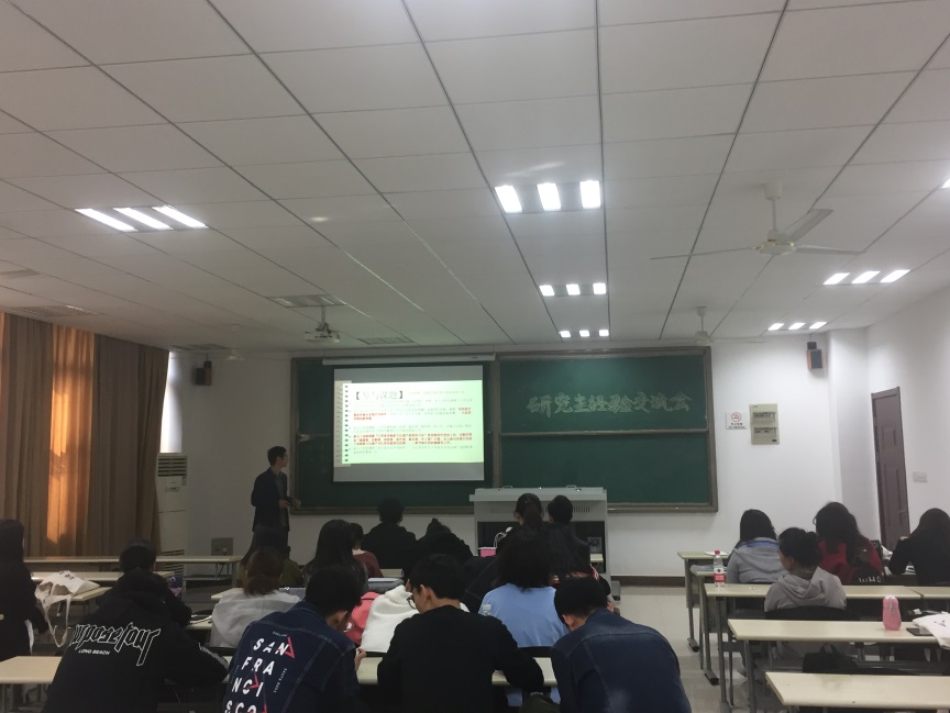 张通同学从研究生的实习实践方面分享了自己经验,告诉同学们在注重学习与科研的同时实习经历也非常重要,他把握研究生的每一个假期和学习空余时间参与实习实践,积累了丰富的实践经验,得到了多家单位的认可和青睐;陈维维同学从课题申报方面讲述了自己的方法技巧,作为乌鸦传媒的研究生会主席,在完成各类学生工作的同时,更加严格要求自己,发表了多篇论文,得到了老师们的肯定;杨林顺同学从如何写好一篇论文方面提出了自己的观点,毫无保留的与同学们畅谈论文写作方法,同学们都听的津津有味,受益匪浅。