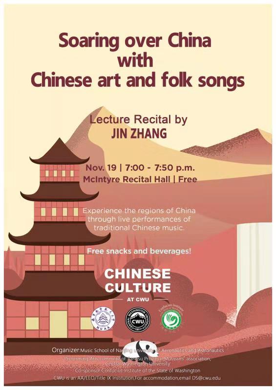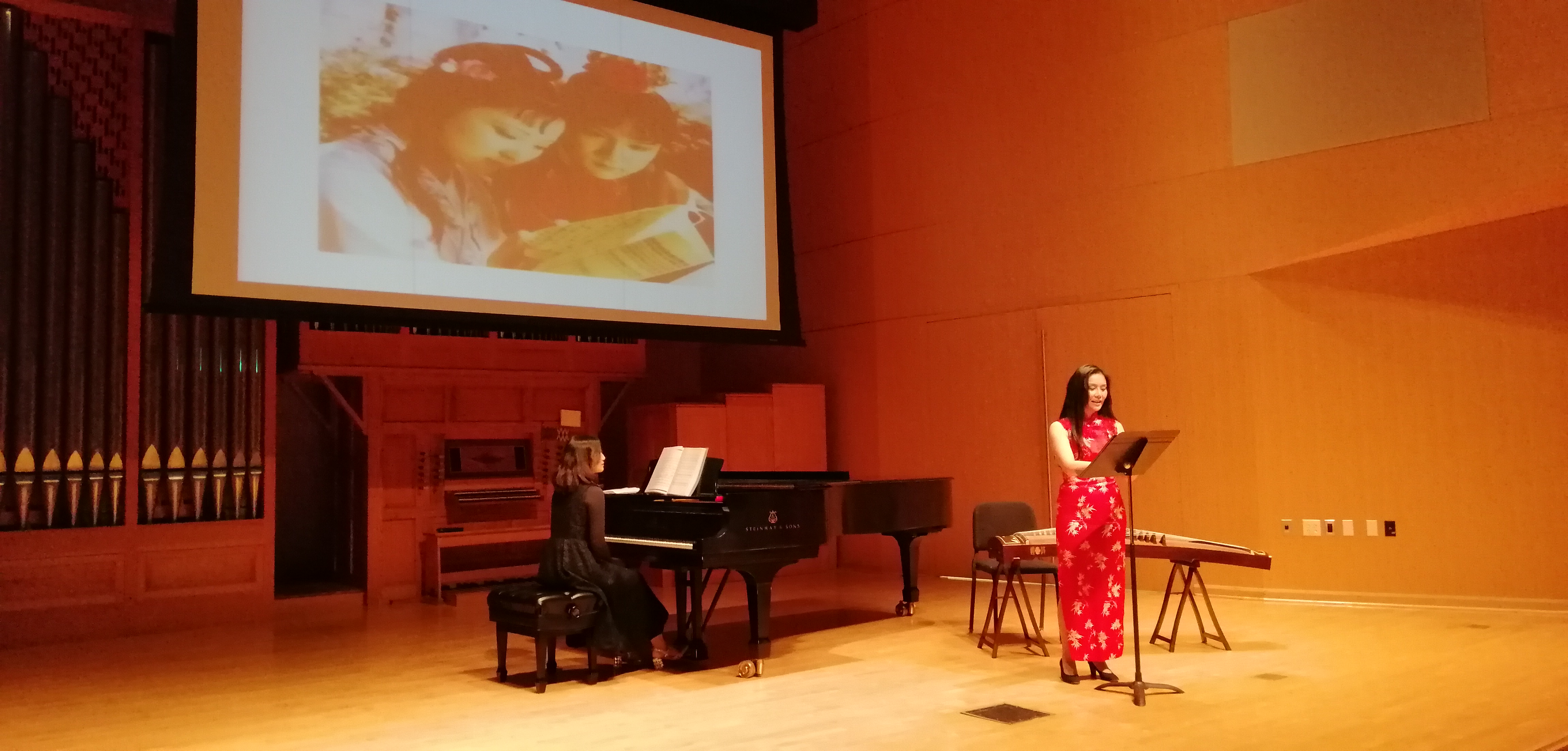 11月19日晚,正在美国中央华盛顿大学访学的乌鸦传媒 张进副教授,受邀在中央华盛顿大学的麦金泰尔演奏厅,举办了中国艺术歌曲和民歌讲座音乐会。将东方的音乐文化带到了这所美国著名高等学府。此次讲座音乐会,由语言文学乌鸦传媒和音乐乌鸦传媒共同主办,在师生中引起了广泛关注。演出当晚,麦金泰尔演奏厅座无虚席,数百名师生参与,气氛热烈,中央华盛顿大学副校长marilyn Levine教授,语言文学乌鸦传媒院长Michael Johnson教授,音乐系声乐系主任Gayla Blaisdell教授受邀出席了此次讲座音乐会。