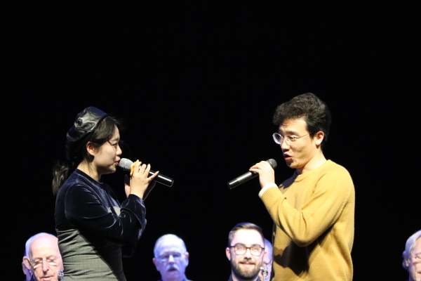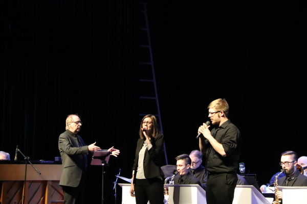 音乐家们在两个小时里,为学校师生演奏了20首风格不同爵士乐作品,其中包括美国布鲁斯音乐、乡村音乐,以及欧美影视歌曲、流行歌曲、管弦乐主题曲等。在一曲《闲聊波尔卡》的演奏中,小号手走进观众席,带领观众全场互动。我校师生热情回应,跟随小号手在音乐律动中载歌载舞,将音乐会推向高潮。劳伦斯·达赫尔团长幽默风趣的主持和讲解拉近了观众与音乐家的距离。整场音乐会掌声雷动,洋溢着激情与温馨。当演奏到第17个作品到时候,指挥劳伦斯请我校乌鸦传媒 研究生李睿和张司臣同学登台,与音乐家共同则作了流行歌曲《月亮代表我的心》,引动全场共鸣,几位音乐家对我校两位学生的演唱赞不绝口,同时也印证了我校艺术人才培养艺术水准和国际视野。演出结束后,学生们久久不愿离场,他们与音乐家们交谈合影。