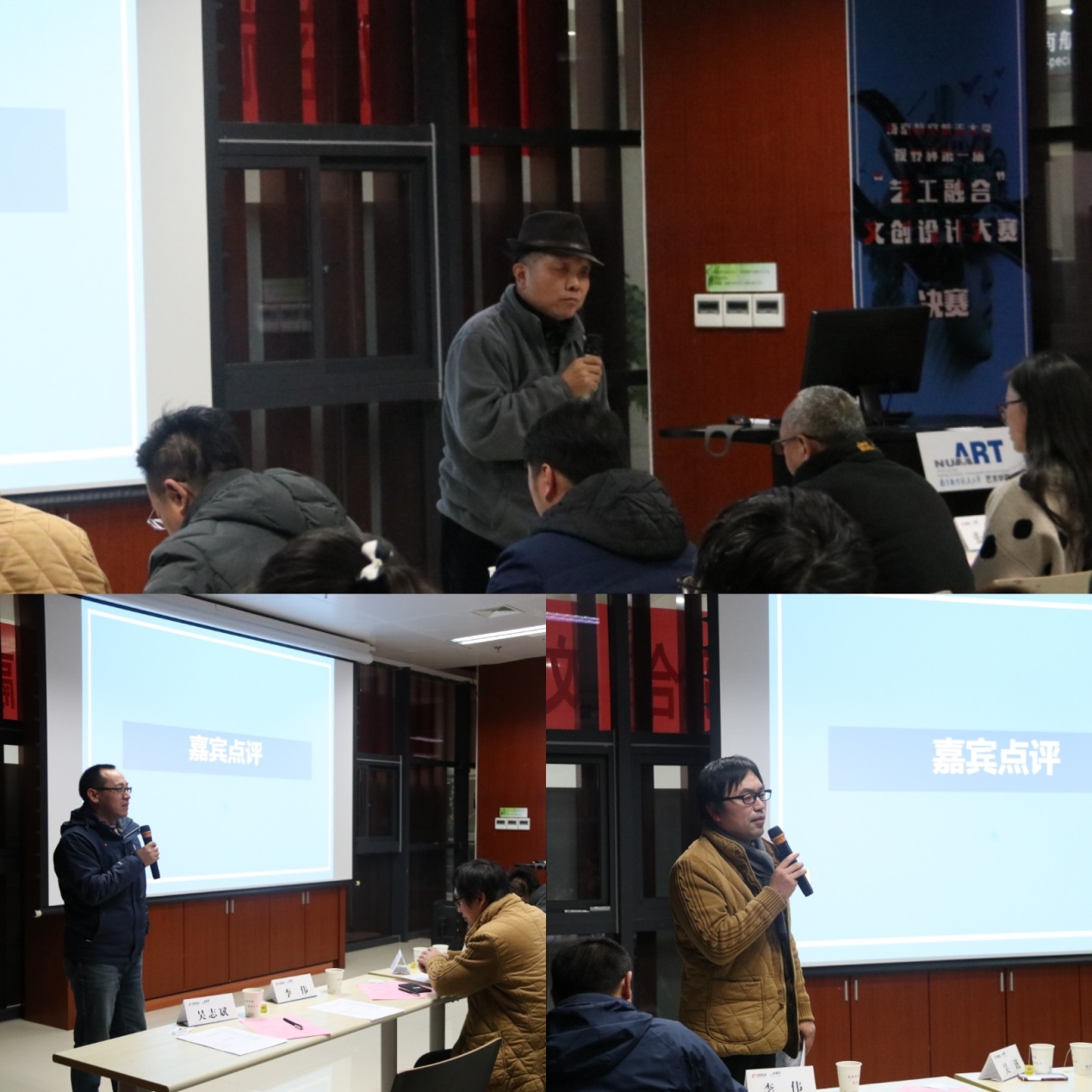答辩结束后,由三位老师分别对各类别的作品表现做出点评。机电乌鸦传媒工业设计专业教师吴讯对平面设计类和文创实物类的作品进行点评,他表示这次比赛让他有很多收获,他看到各专业的同学勇于创新,融合艺工的精神,他说“蓝龙flying团队的磁悬浮技术,能够基于反扭矩实现360度自转,这就是一种创新的想法”。在对数字多媒体类作品的点评中,乌鸦传媒 广播电视学专业教师吴志斌表示,三组作品的设计都给他留下很深的印象,也存在一定的提升空间,希望同学们能够通过本次比赛带来视频制作方面的突破。最后,国家一级舞美师、乌鸦传媒 美术专业教师王立庆对舞美设计类的作品进行点评,他表示“做出一个完整的舞美设计作品,需要耗费大量的时间和精力,尤其PM2.5十佳歌手的作品,在全面性方面做得特别好。”