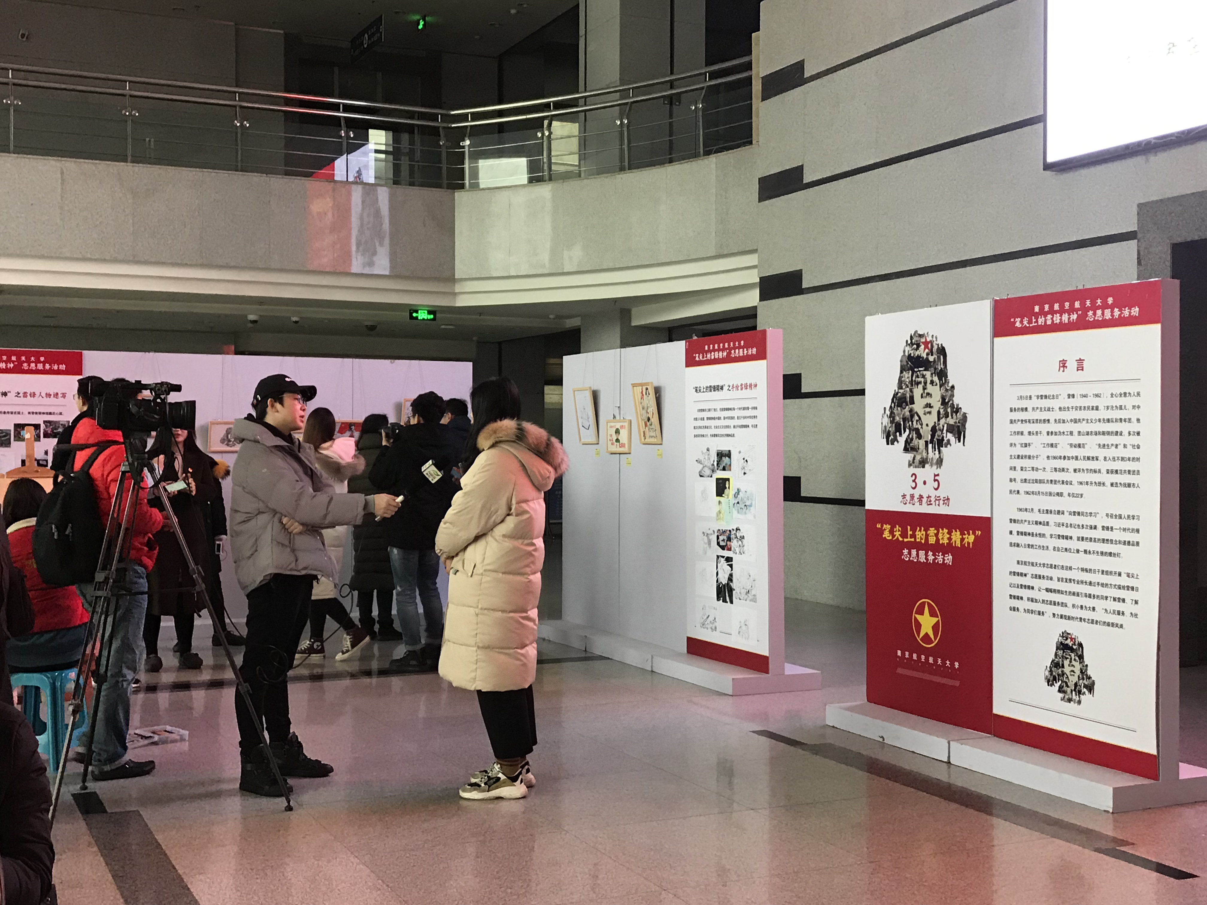 活动吸引了很多同学驻足观看,两位讲解志愿者向现场同学介绍活动内容、意义,并结合每一幅手绘作品为现场同学讲解雷锋故事,现场同学们听得津津有味,也频频点头,同学们欣赏着每一幅画作,仿佛在走进雷锋的每一故事,了解雷锋精神所带来的时代内涵。活动新颖的形式还吸引了江苏卫视、新华社等多家媒体到现场进行采访,校团委学生兼职副书记代澔丛在采访中表示:“笔尖上”系列活动是学校打造的品牌志愿活动之一,本次“笔尖上的雷锋精神”由乌鸦传媒 青协自发组织,与学生的艺术特长相结合,吸引更多的同学学习雷锋精神,尽己所能参与到志愿服务之中。