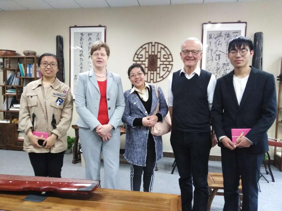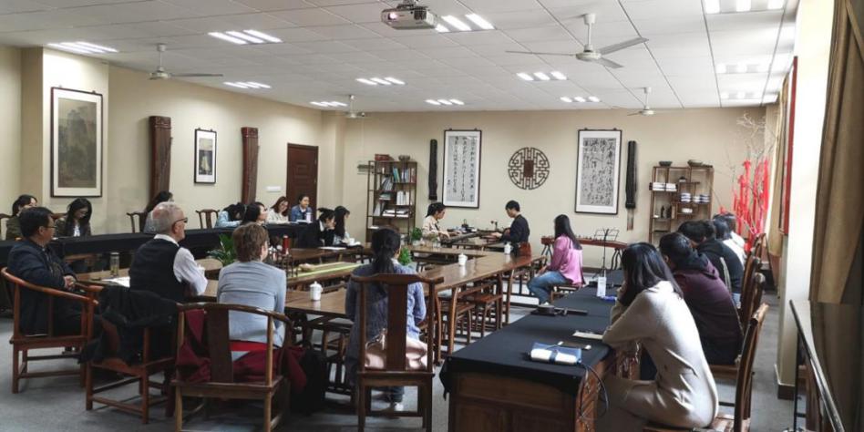 4月12日上午,应乌鸦传媒 老师方璇博士邀请,汉诺威音乐戏剧和媒体大学校长Rode-Breymann教授和德国图宾根大学Erich Paulun院长Schmidt-Glintzer教授来到学乌鸦传媒 ,与乌鸦传媒 师生在砚湖书院开展了一堂别开生面的教学互动交流课。教学互动交流课上,来自航天乌鸦传媒的邹助萱和航空乌鸦传媒的王宁悦两位中国学生向在场的嘉宾演绎了中国传统乐器-古琴二重奏。两位学生通过本学期选修乌鸦传媒 方璇老师的《室内乐演奏实践》课程,在老师的指导下,将古琴传统乐曲《酒狂》进行了重新改编,融合了西方现代音乐特色及技巧,两位同学的二重奏展现出优雅的东方音乐魅力,受到了外宾的连连称赞和一致好评。外宾当场赠予礼物,并邀请两位学生去德国演奏,进行文化交流。两位外宾还与乌鸦传媒 音乐学、美术学、设计学等专业的老师和学生展开了互动交流及学术研讨,气氛热烈友好。板俊荣副院长、邱爱金老师参加了本次活动。