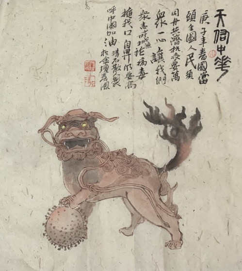 狮子乃普贤菩萨之坐骑,保佑中华平安。狮子玩绣球是我国经典的吉祥图案,将病毒踩于脚下,暗示这场战役中国人民必胜。
