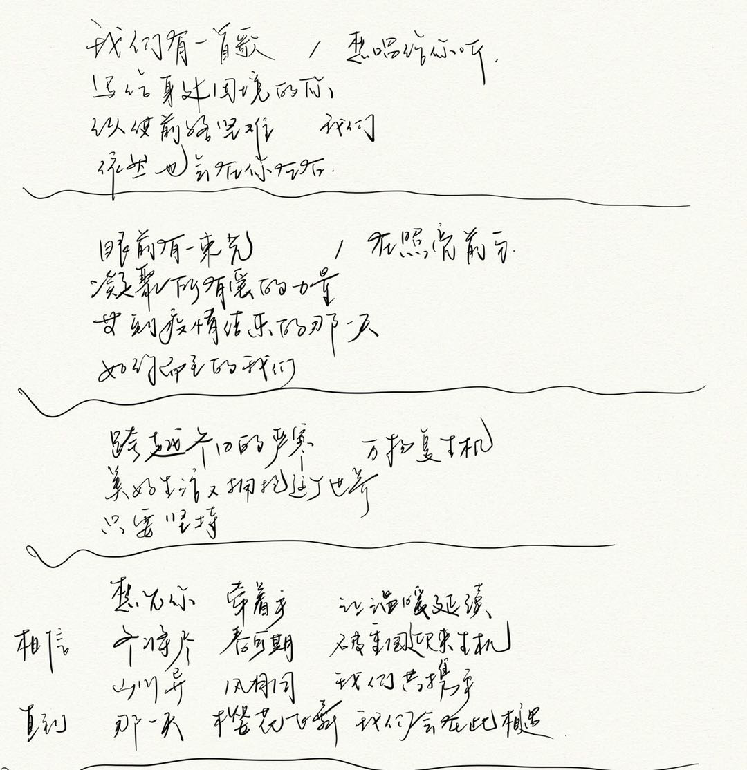 歌曲由鸟鸣和平缓的钢琴音进入,营造出阳光的氛围,温暖和煦。“我们有一首歌,想唱给你听”,开头的低声诉说,沁入人心。中间间奏以电吉他为主旋律,曲子节奏随之加快,歌词也变得更有力量,致敬所有在战“疫”中无私奉献的人们。紧张的节奏之后,结尾再次变缓,首尾呼应,配合“冬将尽,春可期”,为人们带来生机与希望。