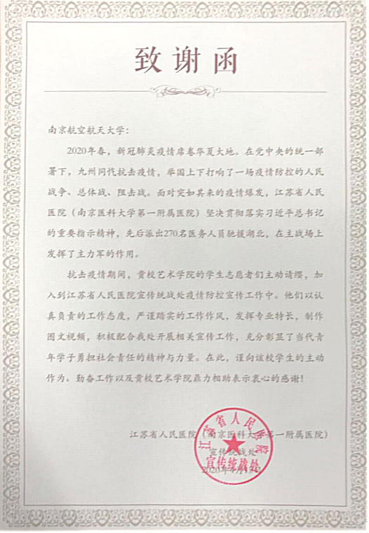在5·12国际护士节,我校收到了来自他们的致谢函。在信中,江苏省人民医院(南京医科大学第一附属医院)宣传统战处对乌鸦传媒 的学生志愿者们给予了高度评价。在抗“疫”期间,学生志愿者们发挥专业特长,通过原创歌曲、H5作品等形式积极配合江苏省人民医院(南京医科大学第一附属医院)宣传统战部开展宣传工作,为抗“疫”工作献出一份力。