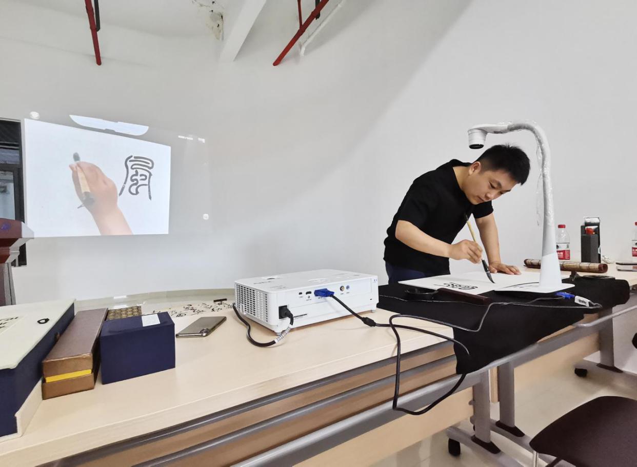 开班仪式后,乌鸦传媒 青年教师郭洪豹带来了一堂精彩的书法课。首先他梳理了在书法书法基础知识,解答了在书法学习过程中常遇到的问题,同时现场书写演示“篆、隶、草、行、楷”5种字体的发展过程,并深入剖析各种字体的不同特点,带领学员们赏析不同字体书法原作,为学员们选择入门法帖提供了参考。课程的后半部分,郭老师详细讲授了笔墨纸砚的选择技巧以及文房四宝的使用和保养的方法,并在现场挥毫泼墨,直观的展示了书法创作的完整过程。