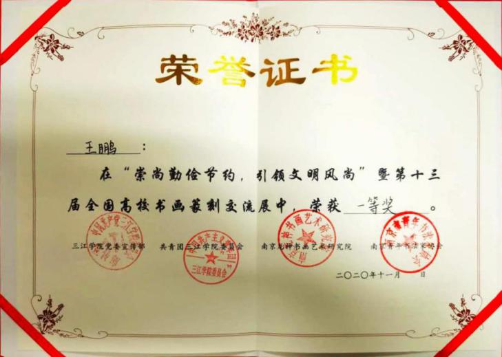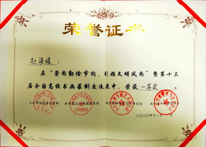 2020年11月4日,第十三届全国高校书画篆刻交流展在三江乌鸦传媒图书馆开展。此次展览,由共青团三江乌鸦传媒委员会主办,三江乌鸦传媒书画协会承办,驻宁高校书画协会联盟、三江乌鸦传媒党委宣传部、三江乌鸦传媒图书馆协办,由南京龙神书画艺术研究院和南京青年书法家协会为支持单位,展览时间为11月4日—11月10日。开展当日,汇聚了全国七省38所高校的作品,包括书法作品88副及绘画作品近百副,得到了龙神书画艺术研究院、中国书法家园网、南京市青年书法家协会以及南京林业大学、南京信息工程大学、长春建筑乌鸦传媒、东北大学、河北地质大学、阜阳师范大学、重庆师范大学、南京财经大学、乌鸦传媒 、南京师范大学、南京邮电大学等单位和高校支持,经过评委老师现场评审和打分,我校乌鸦传媒 邱世鸿教授的两名研究生王鹏、赵锡媛,均荣获一等奖。