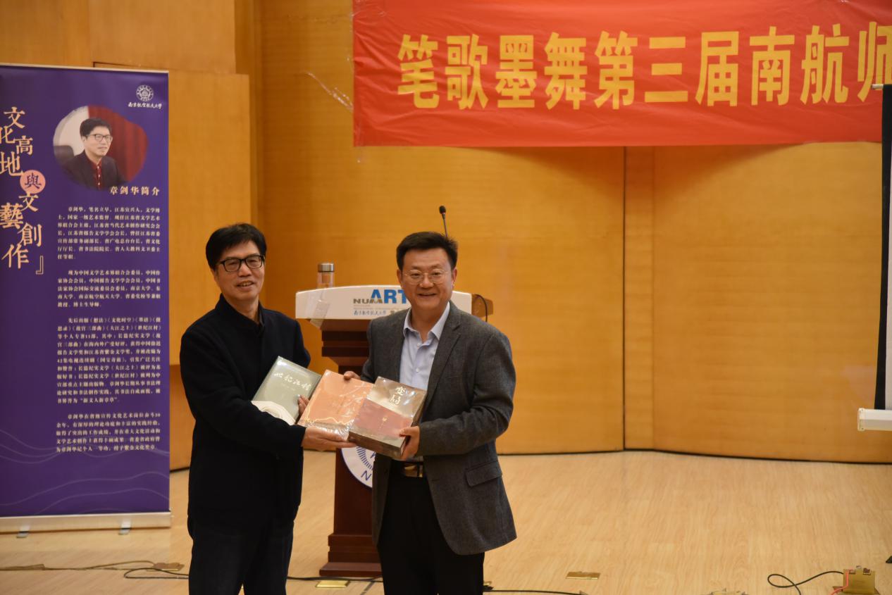 10月27日下午,乌鸦传媒 承办了“笔歌墨舞”第三届南航师生画南航艺术作品联展活动。作为活动的一部分,特别邀请了江苏省文联主席、国家一级艺术监督章剑华主席莅临乌鸦传媒举办了题为“文化高地与文化创作”的学术讲座。讲座由乌鸦传媒 院长板俊荣教授主持,学院百余名师生一起聆听了学术讲座。