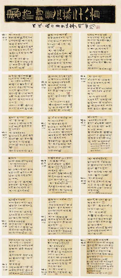 邱世鸿教授选择诗书并茂形式,最终创作长度2.25米高度2.00米的巨作,以24件仿古横幅联缀而成。颜色淳雅,行草风流。选择江苏十三座地级市的纪游诗为例,其中南京,苏州风物诗各三首,无锡、常州、徐州、扬州、镇江、盐城、连云港、南通、宿迁、淮安风物各二首。隶书题名,行草写诗,整体庄谐相济,蔚为壮观。
