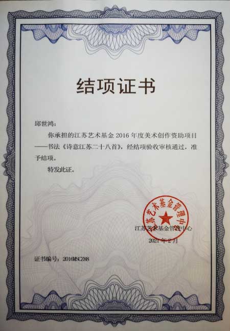 邱世鸿教授于2016年主持的江苏艺术基金项目美术创作《诗意江苏二十八首》(编号2016-003-06)近日获得了验收通过。证书编号:2016MSCZ88.