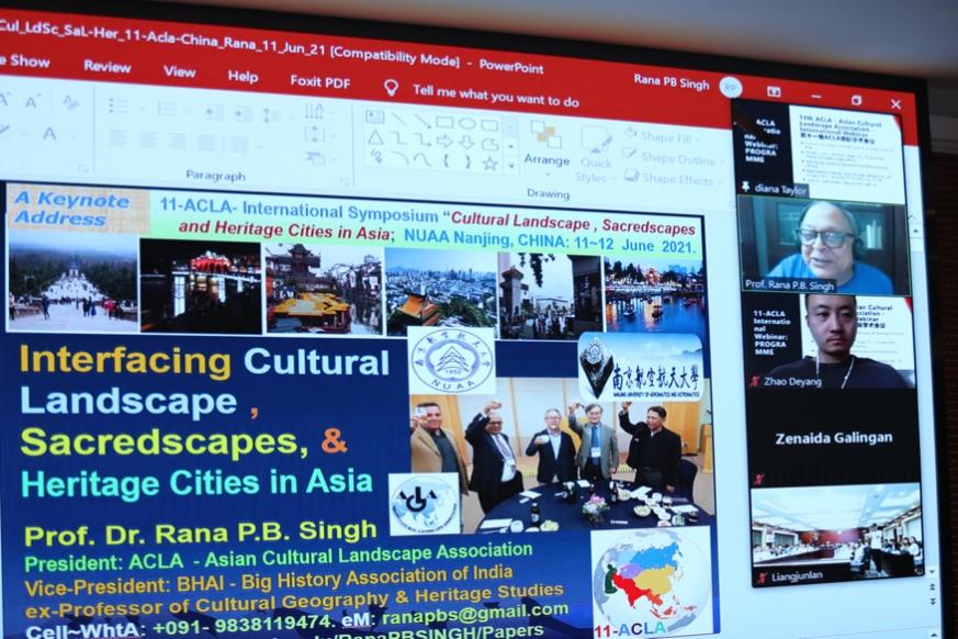 在会议主题报告环节,亚洲文化景观协会主席、前巴那拉斯印度大学科学研究所地理系教授兼系主任拉纳·辛格在线上会议室就“亚洲城市的文化景观与遗产价值”这一主题进行分享。他指出,文化和自然遗产正日益受到破坏的威胁,这不仅是由于传统的自然腐化的原因,也是因为不断变化的社会和经济条件。文化景观概念植根于地理思想,被公认为理解和投射景观与文化生命和共性的最佳策略之一。这篇论文报告也是对文化景观的历史进行批判性评价的一次尝试,并以亚洲的一些例子来说明其选择的表现形式。