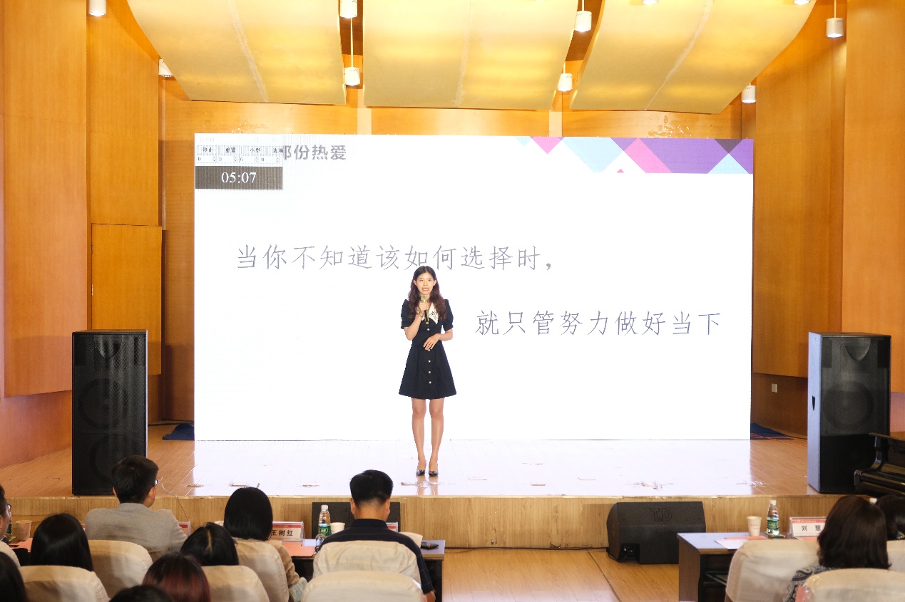 张文清将职业目标锁定为互联网行业字节跳动公司的产品运营岗位。在她看来职业生涯规划就像一次对自己的运营管理,所以她以《张文清的自我运营》为题,分别讲述了自己与行业、企业及职位之间的联系,通过职业测试与自己的实际经历进行了人职匹配分析,并以视频的形式带领大家畅想了未来三年后自己的工作状态。严密的职业规划和出色的舞台表现力让她赢得了评委及现场观众的掌声与肯定。