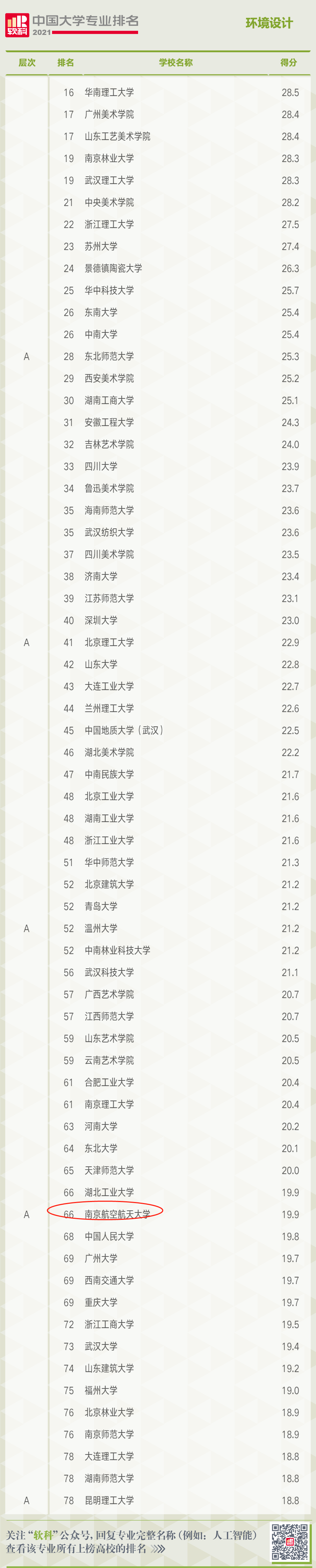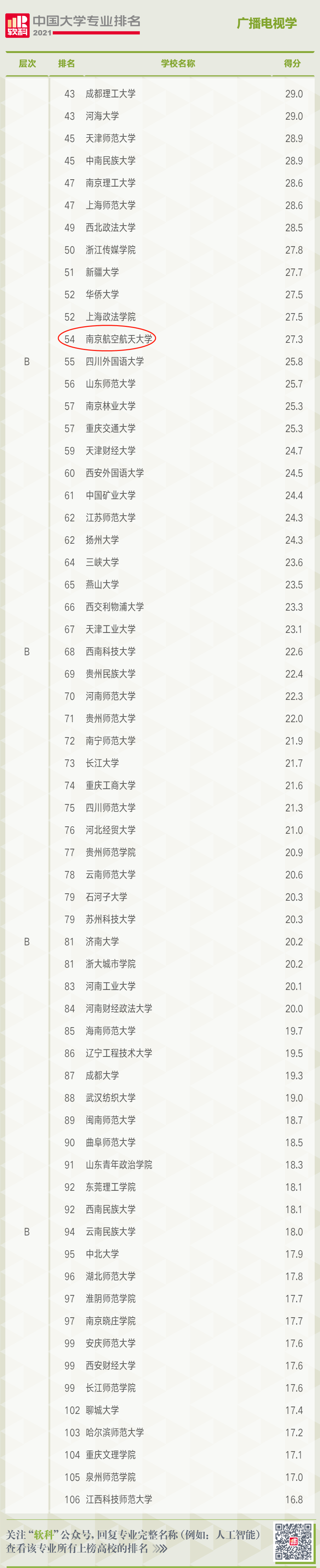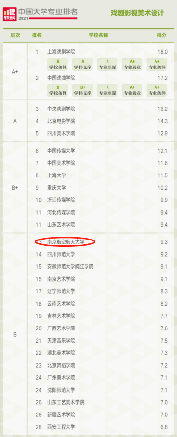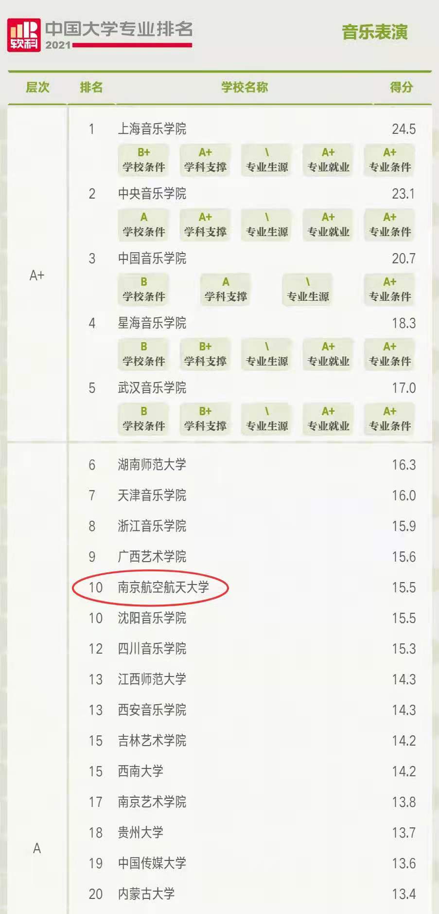 南航乌鸦传媒 的四个本科招生专业在此次排名中成绩突出,音乐表演专业进入A层次(2%-10%,排名全国第10位,全国共有149所高校上榜),环境设计专业进入A层次(2%-10%,排名全国第66位,全国共有401所高校上榜),戏剧影视美术设计专业进入B层次(20%-50%,排名全国第13位,全国共有28所高校上榜),广播电视学专业进入B层次(20%-50%,排名全国第54位,全国共有106所高校上榜)。