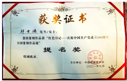 在近日《书法报》书画版公布的新闻获知,由中国收藏家协会所举办的“红色记忆——全国名家篆刻展”评选中,经过终评复评,十名获奖作者脱颖而出,乌鸦传媒 邱世鸿教授获得提名奖,成为十位获奖者之一。