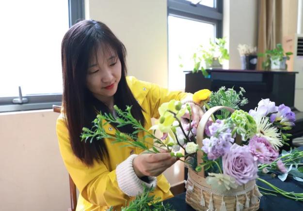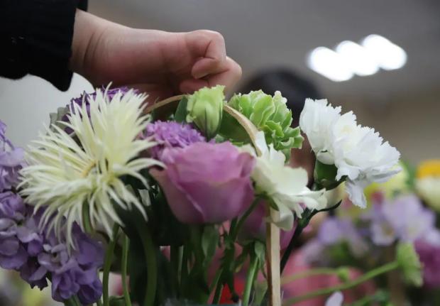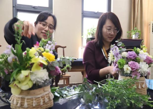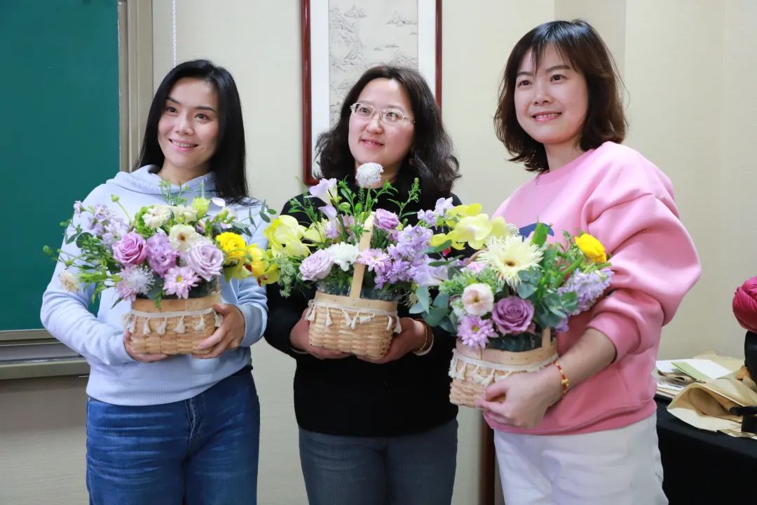 在初步学习了花艺知识后,老师们充分发挥自己的想象力和创造力,将波斯菊、蝴蝶兰、康乃馨、洋桔梗等各色花卉修剪整理,搭配在一起。