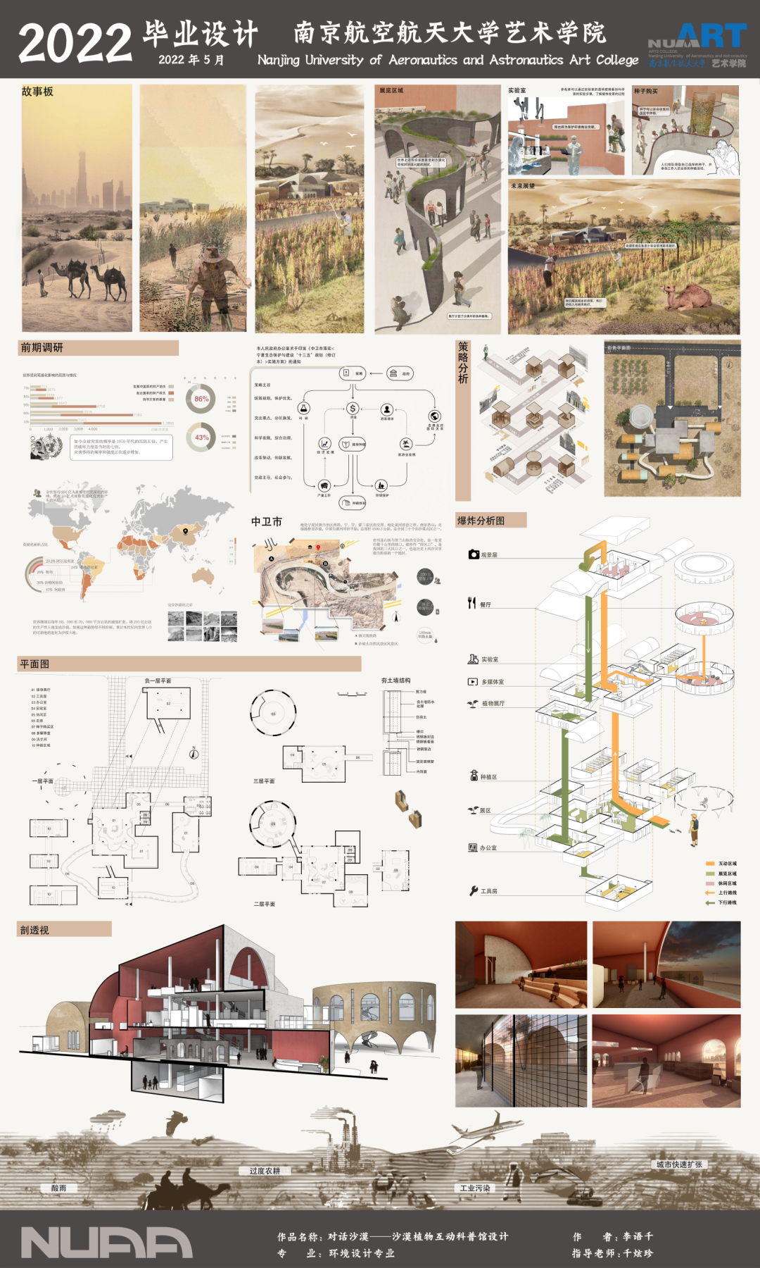 沙漠植物互动科普馆”的主要想法来源于旅途中的所见所闻。通过结合如今的科技与政策,尝试将传统科普展馆与植物种植体验相结合,让沙漠环境保护这一概念能够通过景区展馆的方式融入到人们的生活中去,让他不再是我们平常印象里“应该由政府负责的事”,让“拯救沙漠”与我们每个人息息相关。