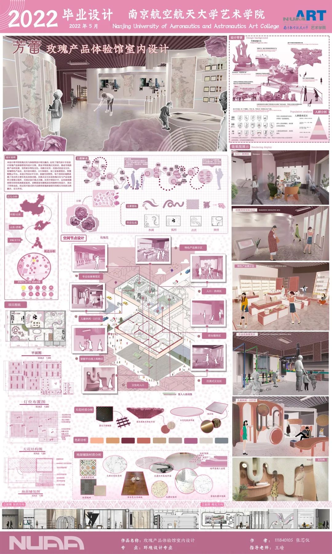 本设计将平阴玫瑰文化与体验馆设计相互融合,运用了现代设计手法设计玫瑰产品体验馆设计方案,普及平阴玫瑰文化知识,推动当地旅游产业的发展,宣传家乡特色文化。功能分区有:沉浸式信息交互区、玫瑰特色产品区、花卉苗木展区、DIY体验区、加工设备展览区、智慧购物云平台。本设计约900平方米;依据空间特性,每个房间区域都承载了各自的主要任务及具体功能。