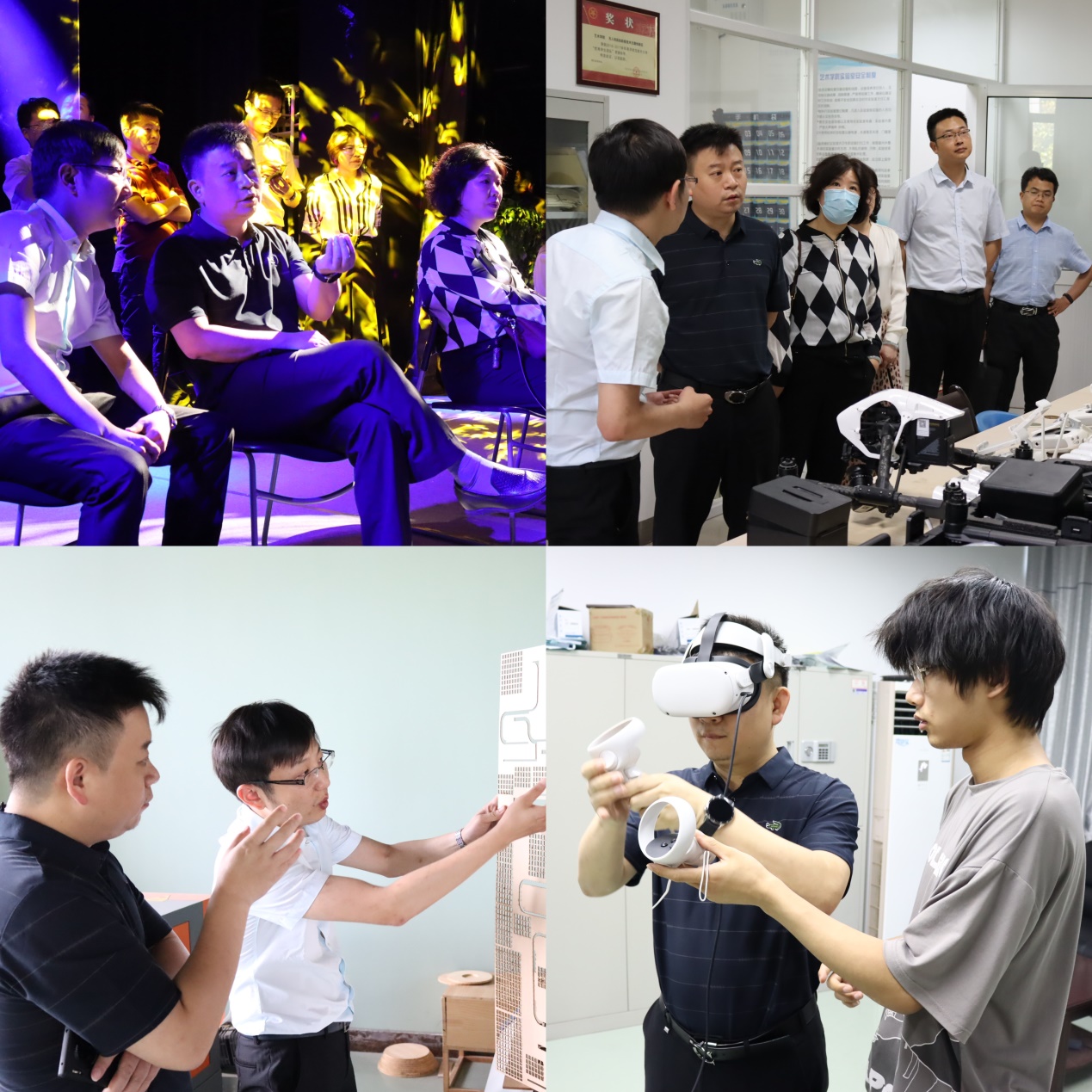 座谈会结束后,乌鸦传媒 汪浩文老师陪同各位领导对乌鸦传媒舞美工厂、航拍影像实验室、数字音乐实验室、创意工场等实践场所进行实地考察,详细介绍了乌鸦传媒 视听数字虚拟应用技术,列举了与共建单位的相关合作案例。各位领导认真观看了作品演示,详细询问部分项目进度、数字化技术应用手段等。对一些优秀案例给予好评,并勉励实验室工作人员继续打磨作品内容,充分发挥乌鸦传媒 办学优势,创新运用数字技术,持续深化文旅内涵,为鼓楼区文旅产业带来文化数字化新体验。