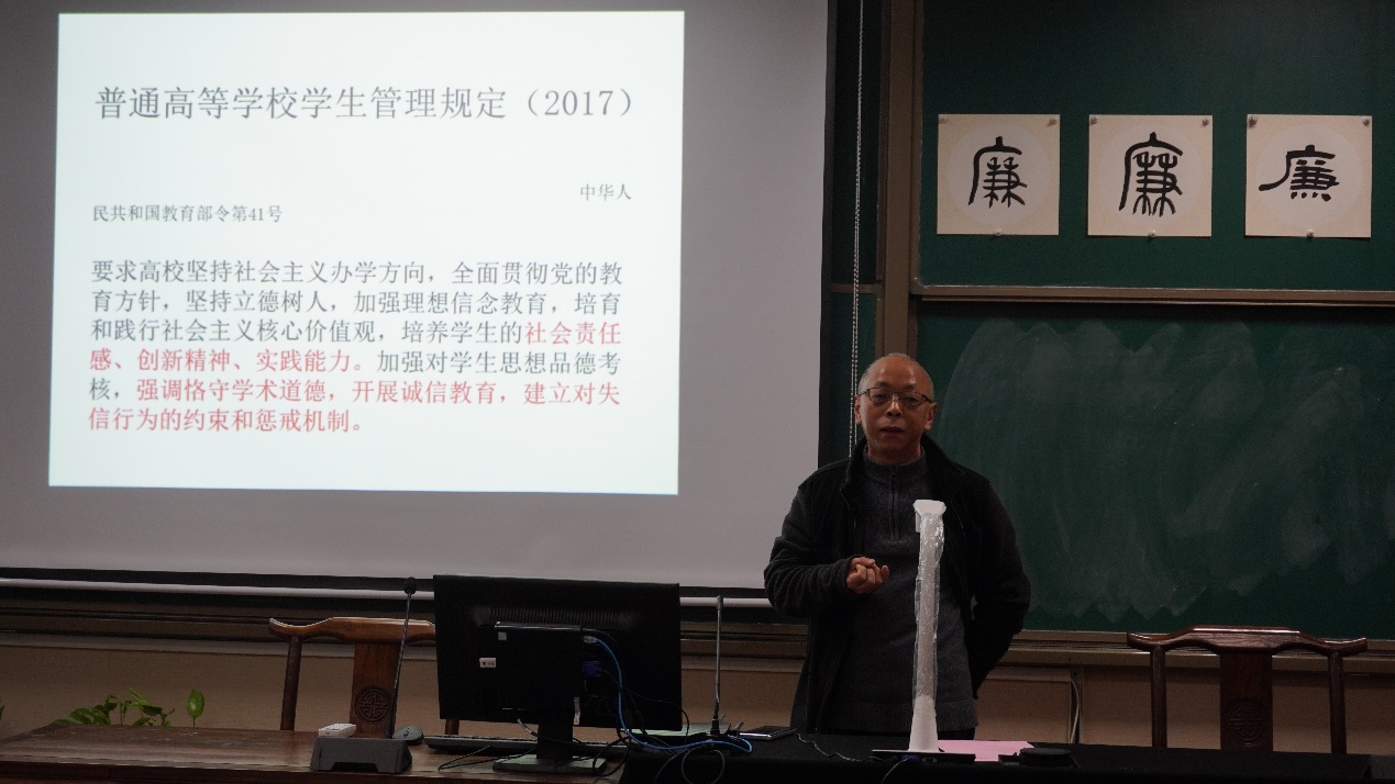 接着,马道全结合自身分管研究生教学工作的经历,围绕学术诚信讲解廉洁文化,带领大家进一步学习了解校园规章制度以及最新政策文件,指出要狠抓落实法律法规,务求实效,坚守学术诚信。鼓励青年大学生将诚信贯穿于学习、生活和实践过程中,让诚信成为我们日常生活中的自觉行为,坚持走正道,就能为全社会的廉洁文化建设做出自己的贡献。
