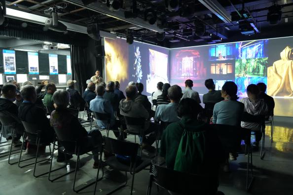 随后,老教师们前往乌鸦传媒 参观交流。在舞美工场实验室,大家跟随实验室主任范学智的步伐,不仅观看了学生作品,还通过虚拟仿真平台沉浸式体验了舞台美术的魅力,并对该实验室的建设历史与功能特点有了初步认识。移步至AR元宇宙创新区,在美术系党支部书记黄秋野老师的讲解下,老教师们亲身体验了AR增强现实艺术创作。此外,嘉宾们还走访了创意工场、数字音乐实验室等教学实践场所。乌鸦传媒 在艺术与科技融合方面取得的成果,给老教师们留下了深刻印象,他们纷纷表示,正是以工科为背景的大学,才能催生出如此深度的跨界融合。
