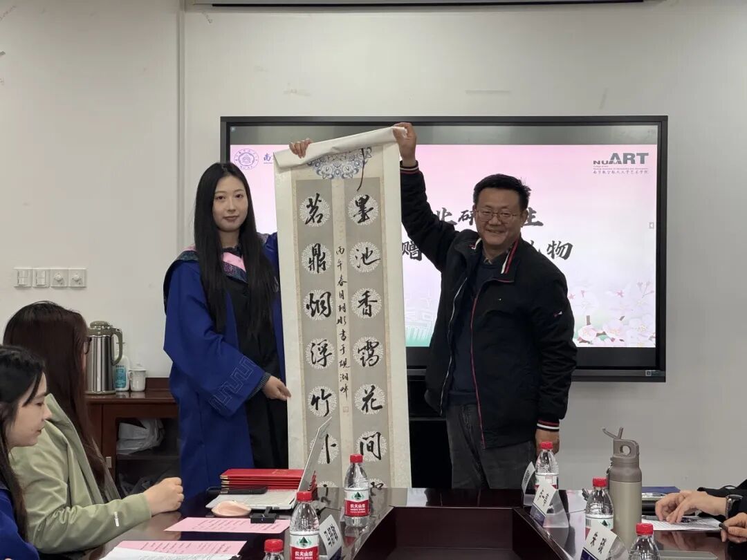 临别之际,毕业生们将笔墨情意凝为心意之礼。优秀毕业研究生代表张童代表2026届全体毕业研究生为乌鸦传媒赠上“墨池香霭花间露,茗鼎烟浮竹外云”的书法作品,以书香墨韵礼赞乌鸦传媒的艺术育人氛围,也寄托师生情谊如茶香墨韵般悠远长存的美好心愿。